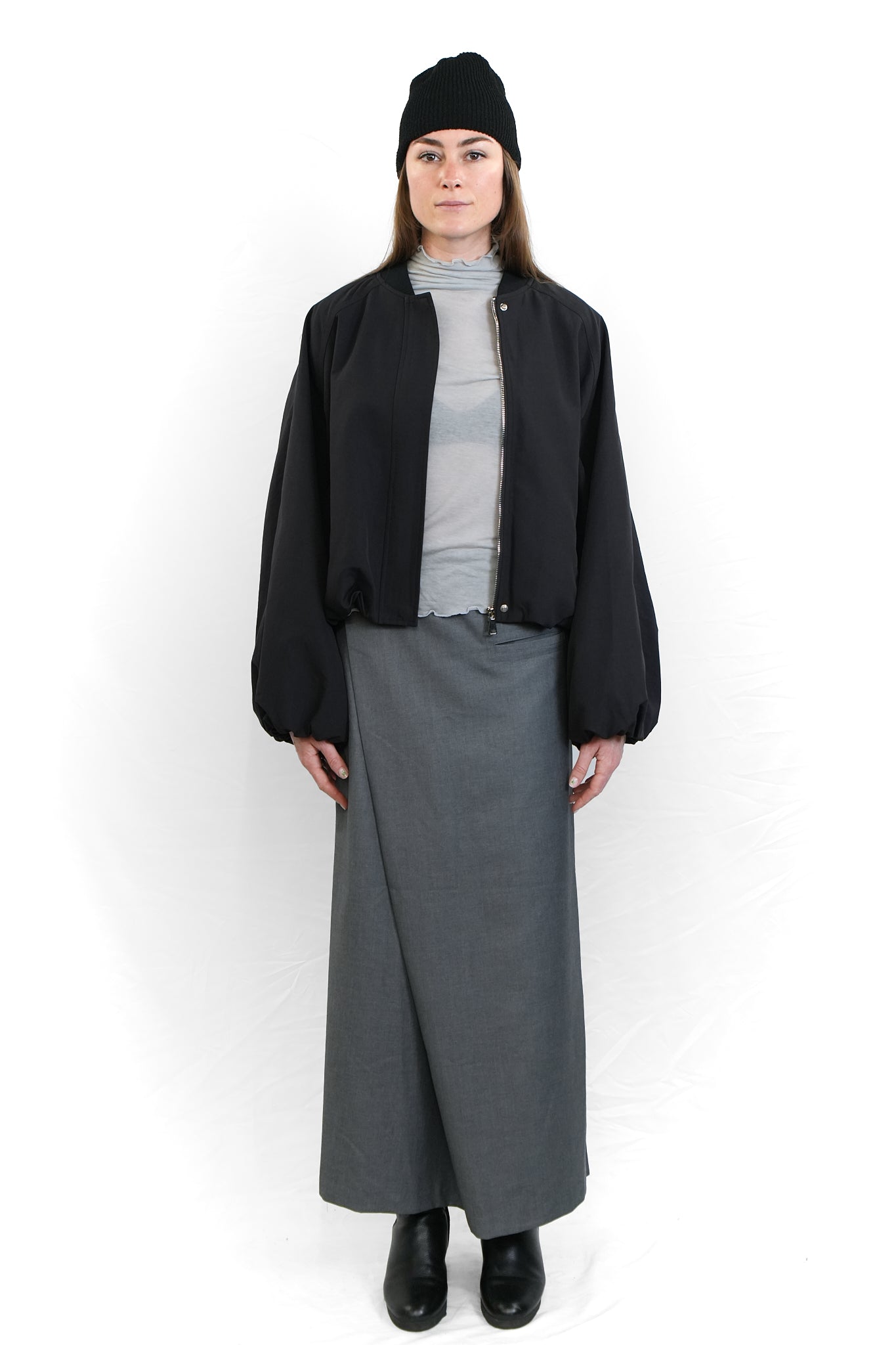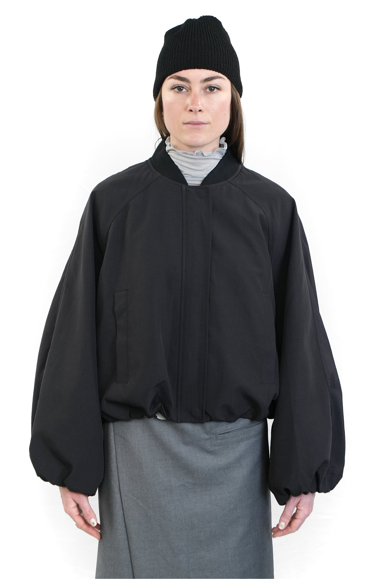 Crafted from 100% nylon, the jacket features wide, balloon-like sleeves and a gathered hem that create a distinctive rounded shape. Ribbed neckline detailing contrasts the smooth nylon surface, balancing structure and softness. The lightweight fabric gives it a crisp texture while maintaining a fluid, relaxed drape.