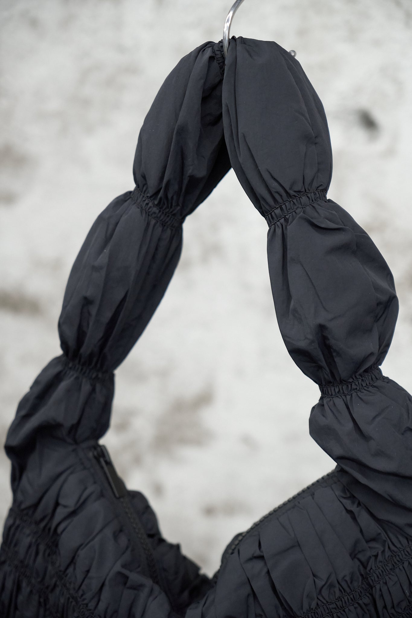 The BLACK RUCHED SHOULDER BAG redefines volume and texture with its sculptural silhouette. Crafted from lightweight nylon, the bag features all-over ruched detailing that creates a soft yet structured form. The wide gathered strap flows seamlessly into the body, offering both comfort and bold visual impact.