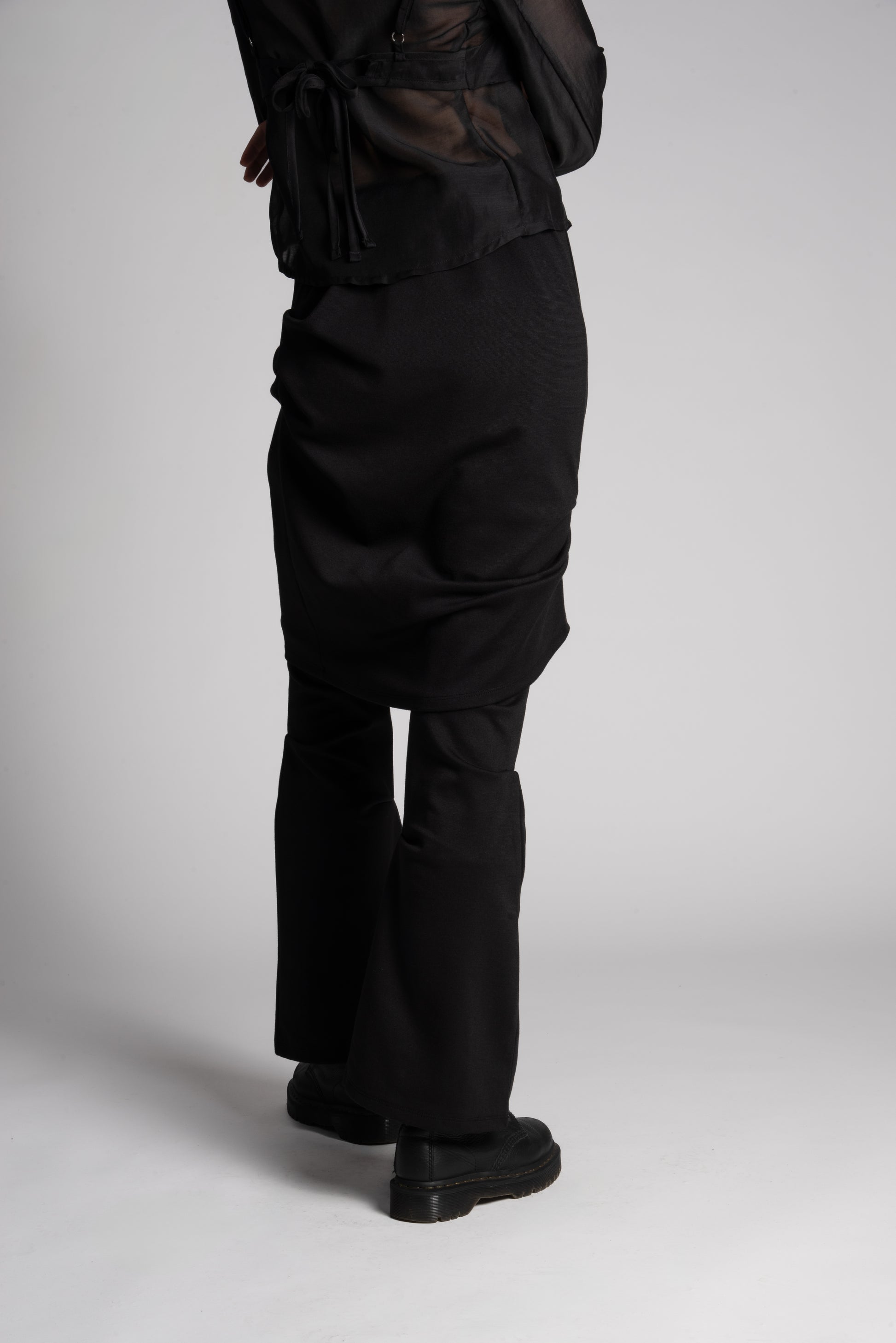 Designed with an integrated skirt overlay, these pants introduce a sculptural, three-dimensional effect through layered paneling. The fluid drape of the skirt combined with the tailored leg underneath adds a refined, utilitarian edge to the avant-garde form.
