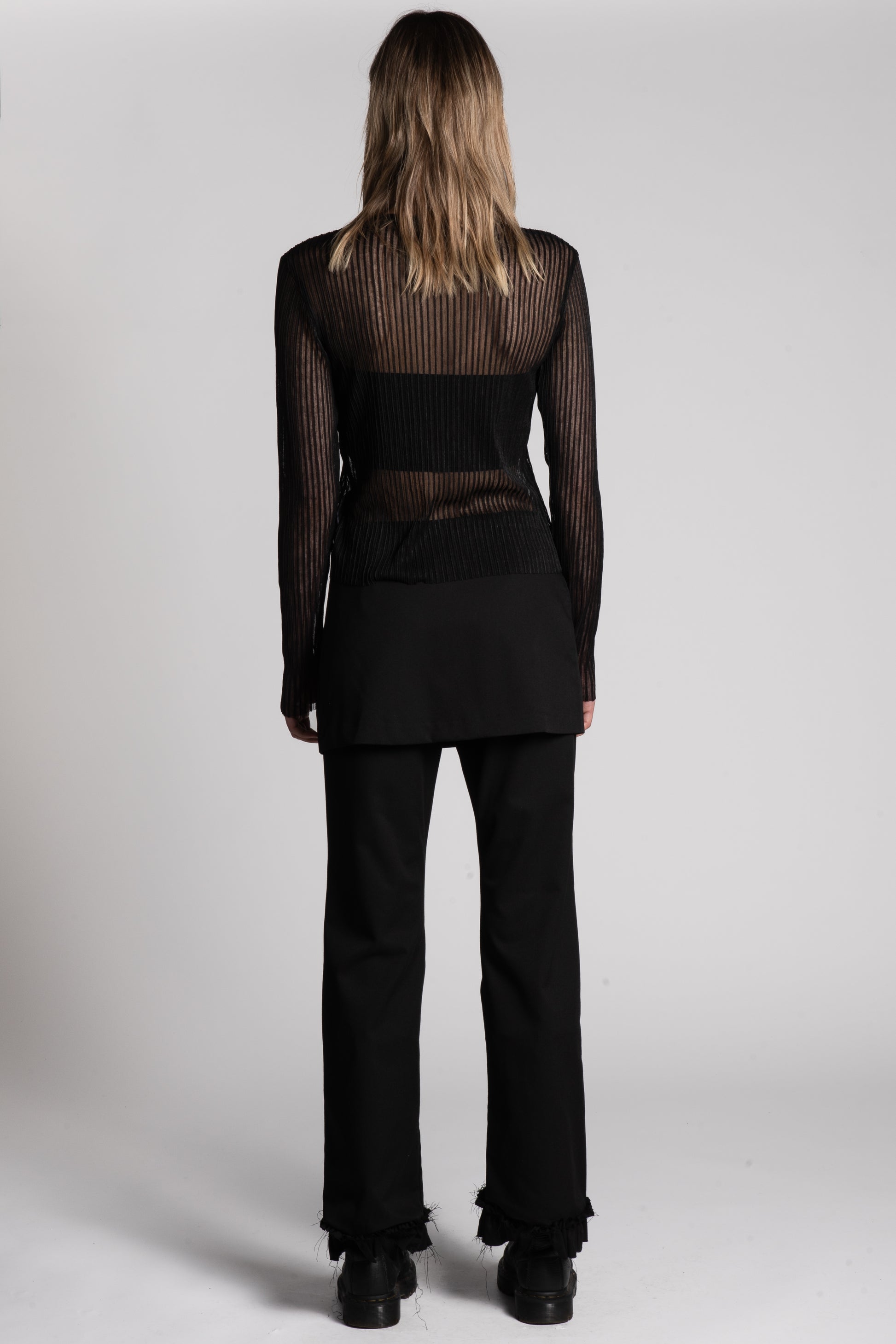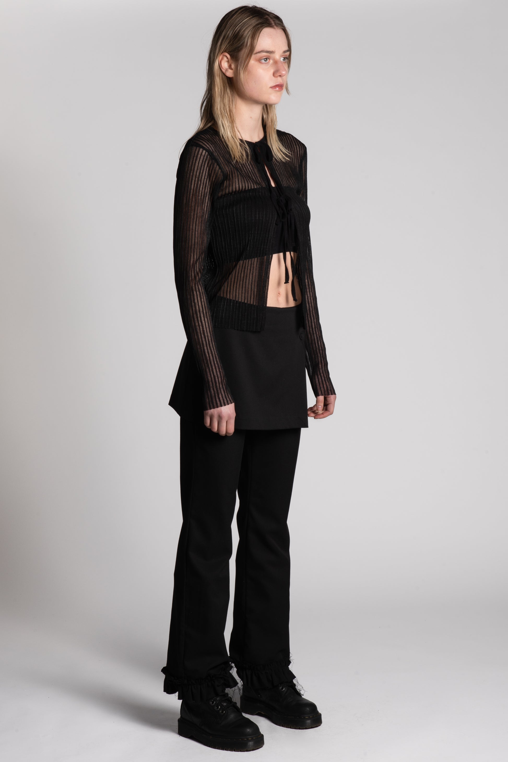 The BLACK MINI SKIRT LAYER PANTS FRILLED reinterpret volume and form through architectural construction.