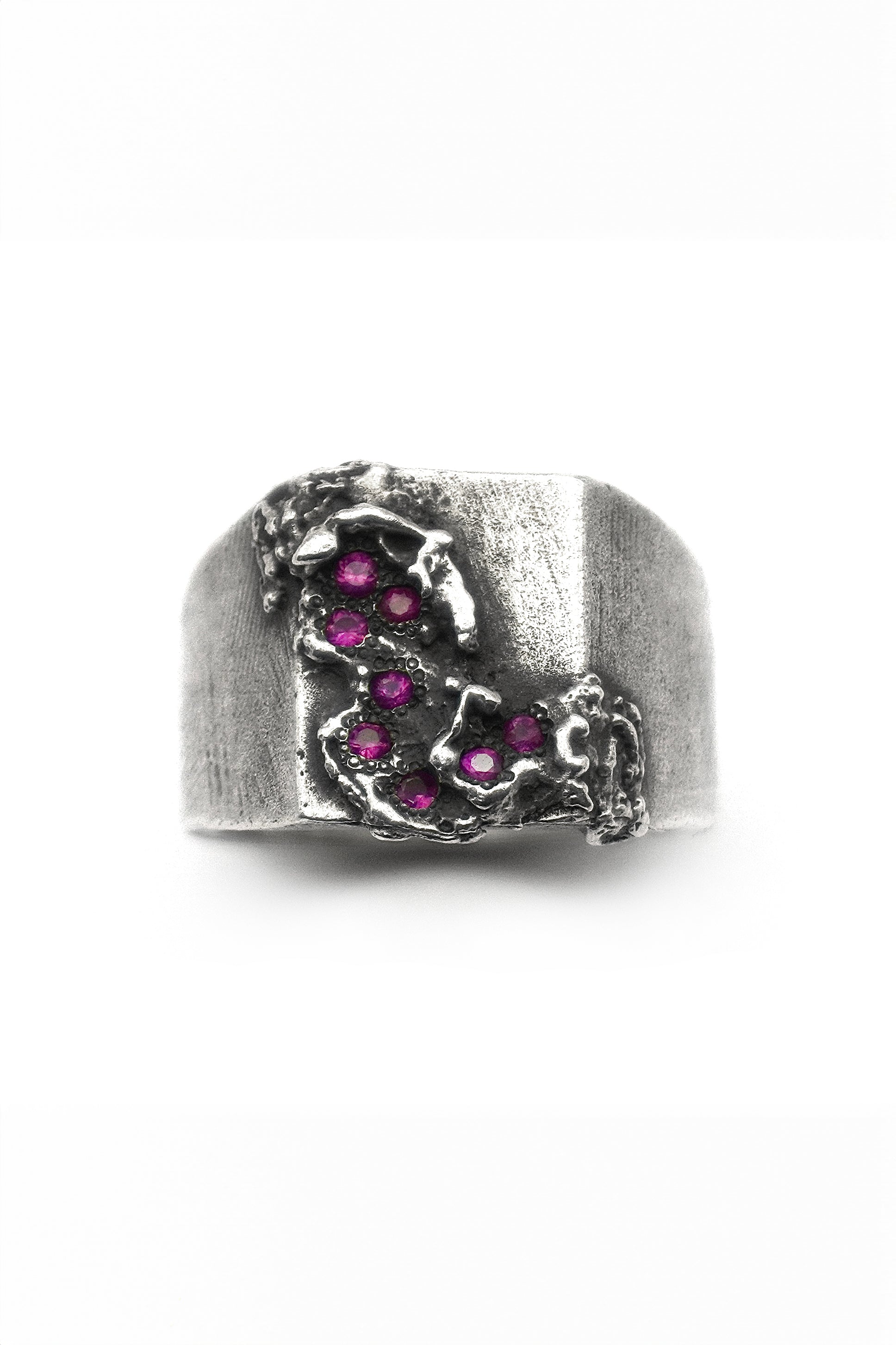 A natural ruby from India is set on top of the texture expressed by dismantling the mask.