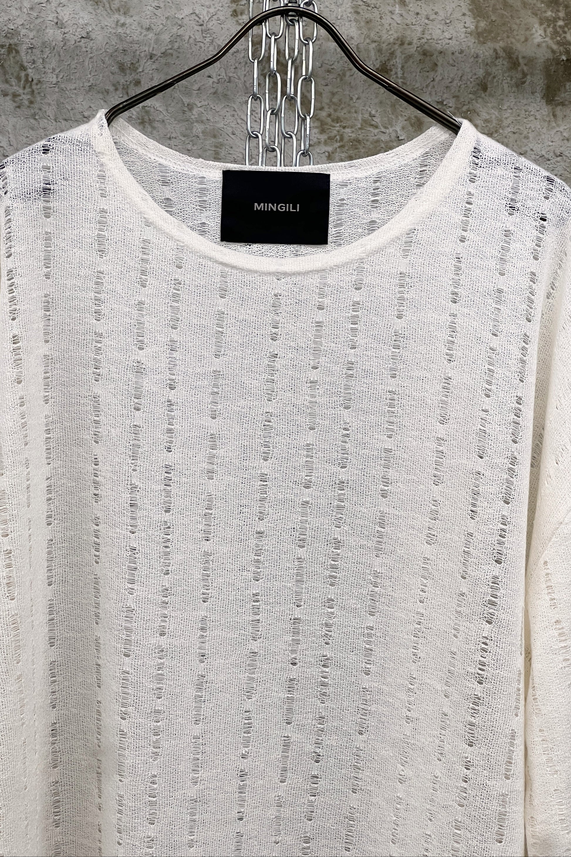 This off-white textured crewneck features a regular linear knit pattern, offering both structure and softness. Worn as a lightweight layer or on its own, it brings subtle dimension to any outfit.