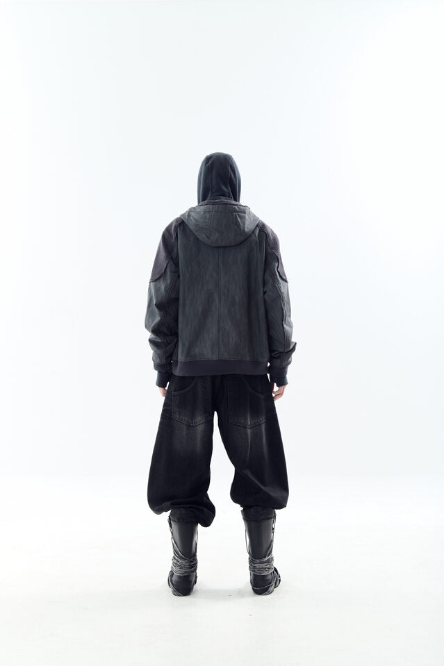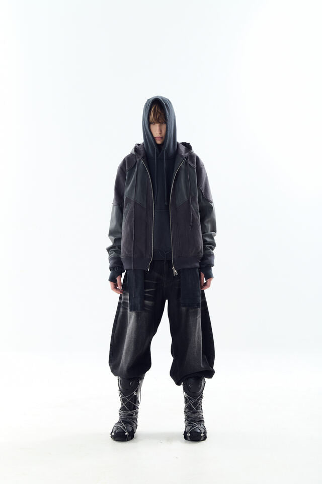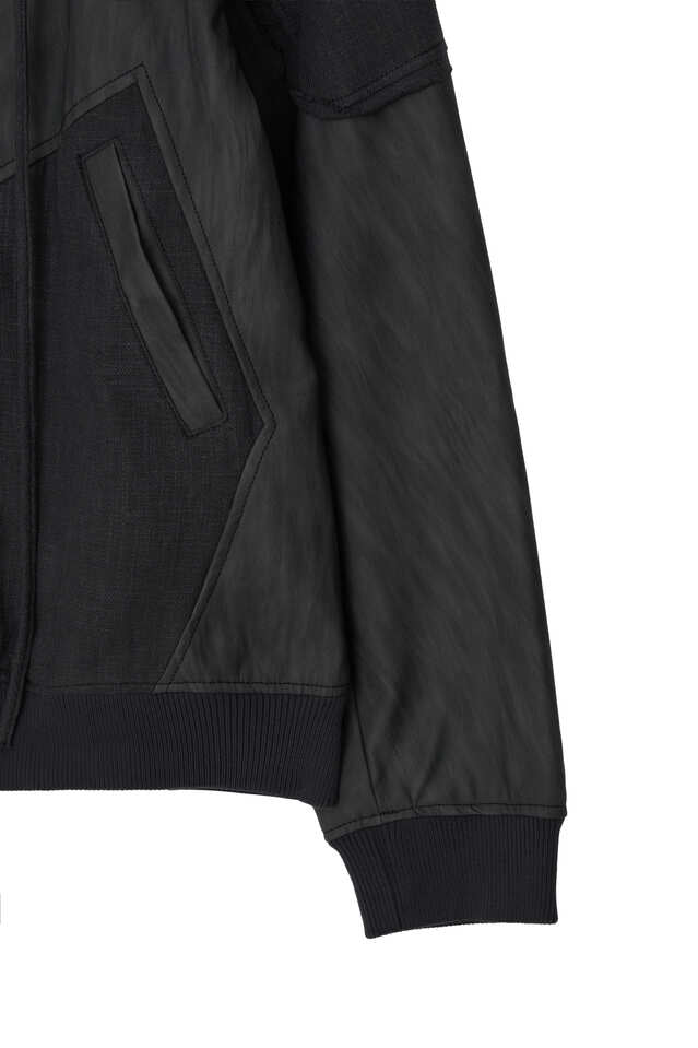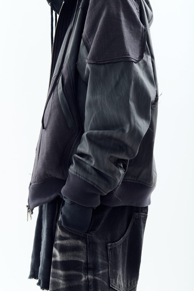 DESTROYED LEATHER AND LINEN HOODIE ZIP-UP JACKET