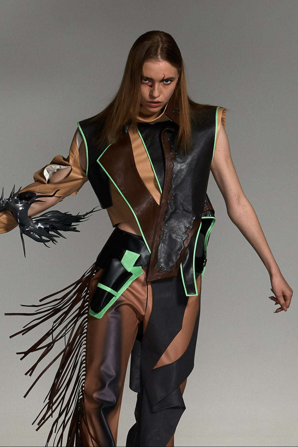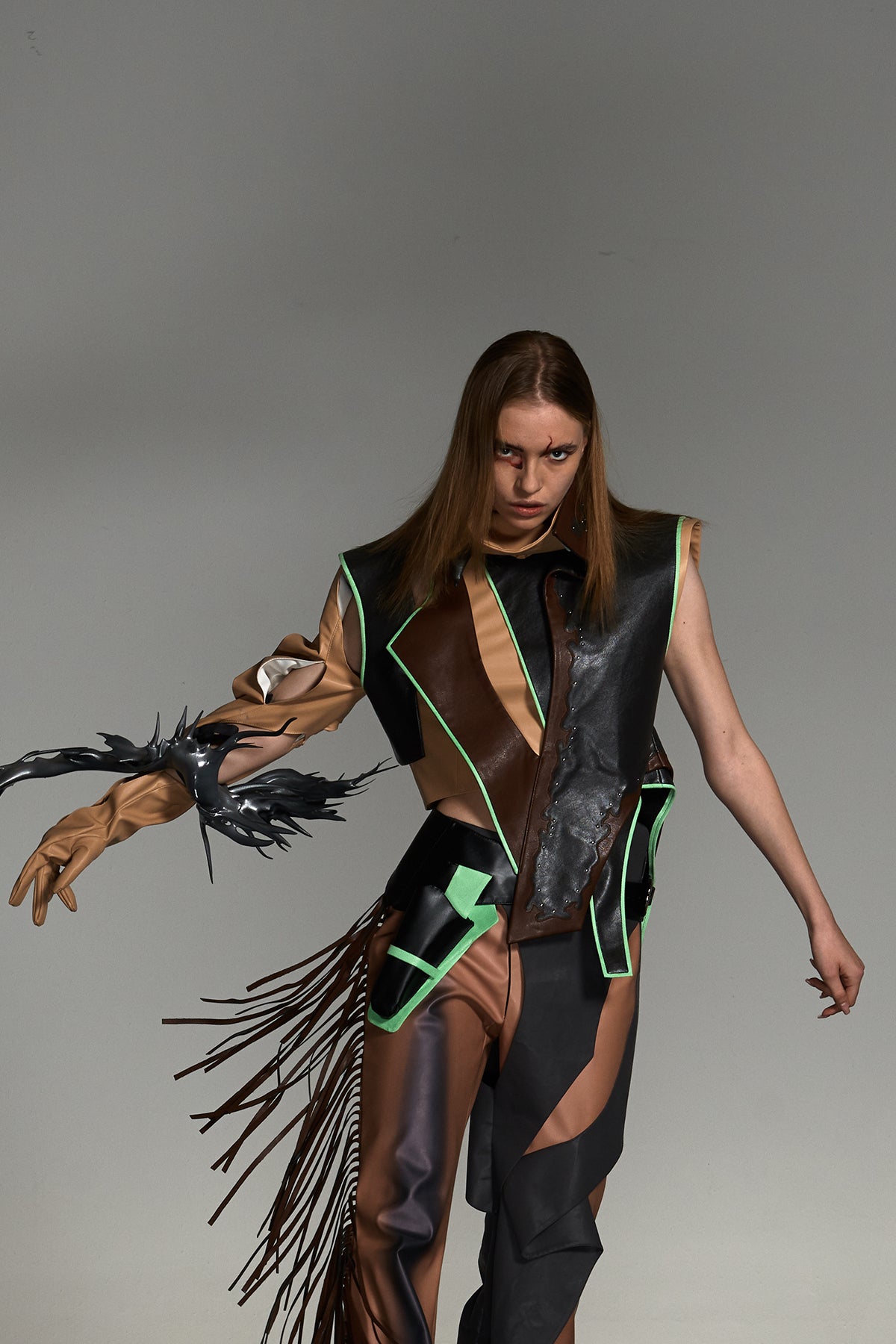 In her designs, XUHUI ZHAO specialises in combining geometric silhouettes, structural tailoring and meticulous craftsmanship. By blending natural fabrics with functional materials, she creates powerful, sculptural forms. Her palette centres on subdued earth tones and low-saturation hues, forging a restrained yet tension-filled visual language that embodies both cultural depth and contemporary aesthetics.