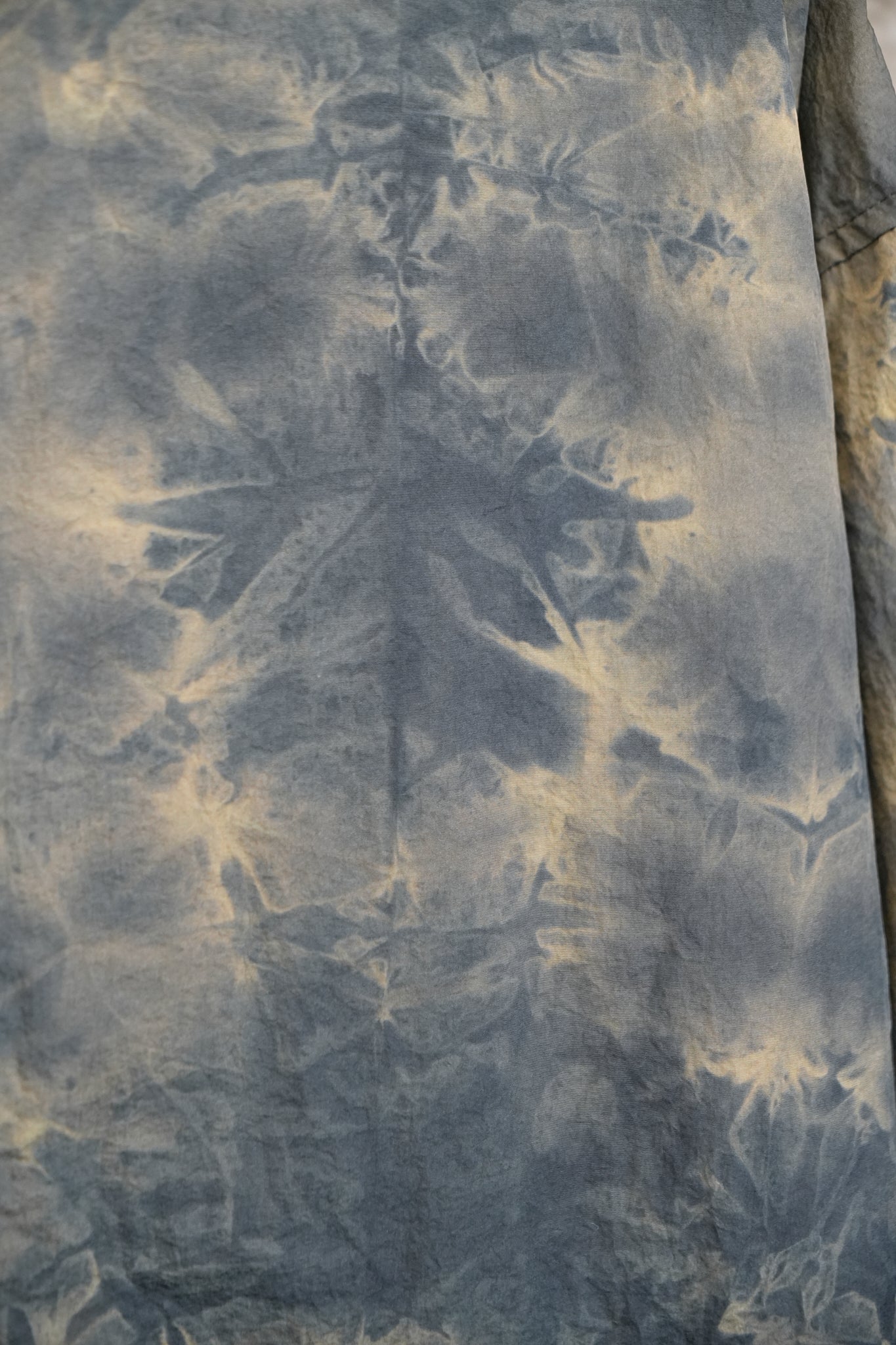 Crafted from a lightweight nylon-cotton blend, the surface features a hand-dyed mix of moss green and charcoal tones, evoking the irregular patterns of oxidation and mineral weathering. Each piece is uniquely finished, with subtle variations that enhance its tactile and organic character.