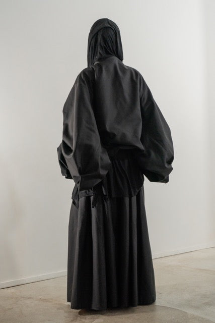 Designed with a clean neckline and minimal construction, the jacket drapes effortlessly over the body and layers easily over both structured and fluid pieces. Subtle gathering and controlled fullness enhance the shape, emphasizing balance, proportion, and movement.