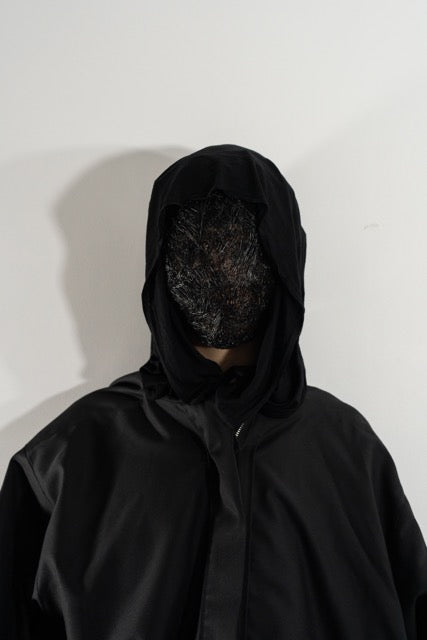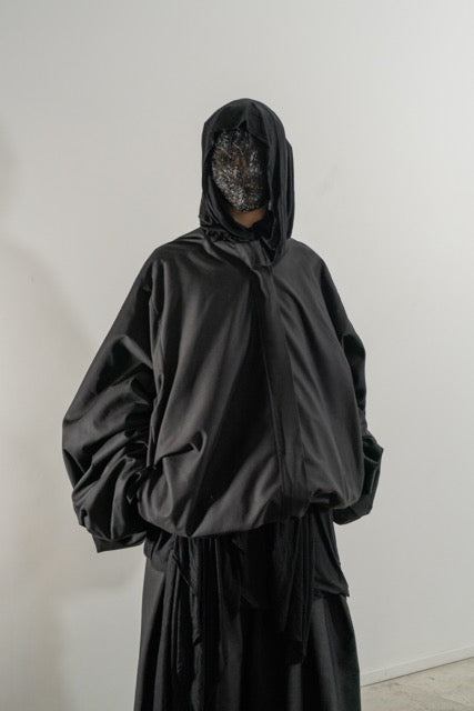 Crafted from 100% cotton, this oversized bomber jacket is defined by its dramatic volume and sculptural proportions. The silhouette is intentionally oversized, featuring dropped shoulders and generously cut sleeves that create a strong yet fluid presence. The cotton fabric offers structure while remaining breathable, allowing the garment to hold its form without stiffness.