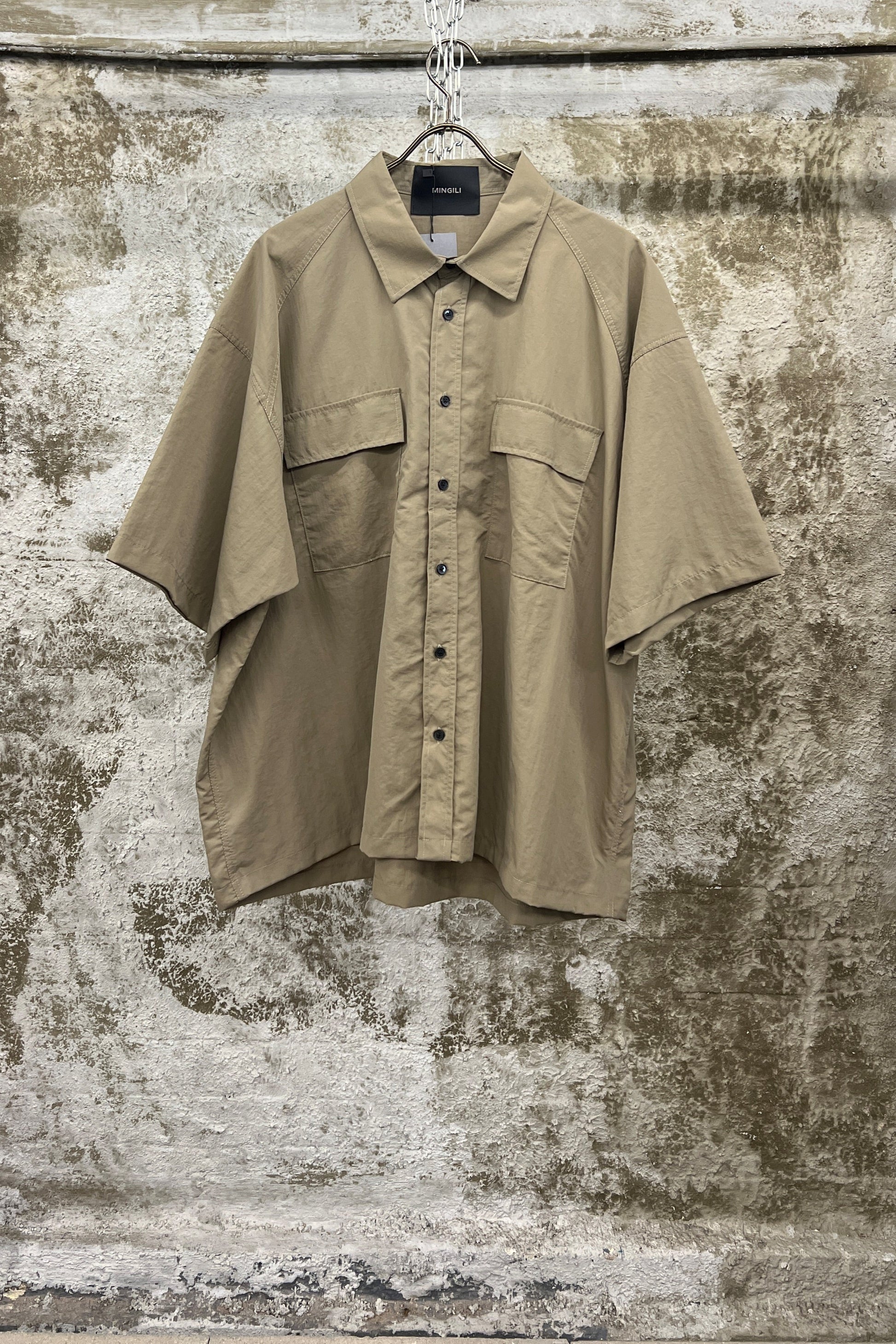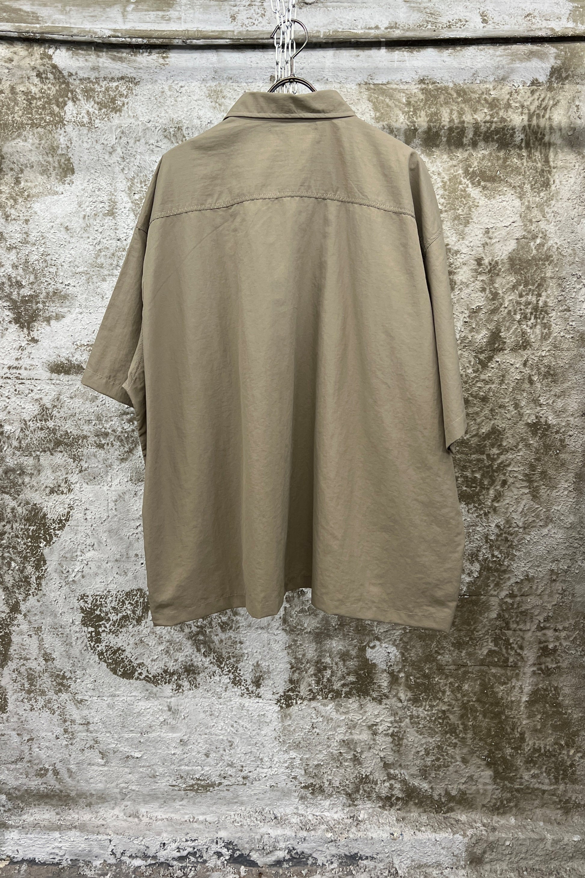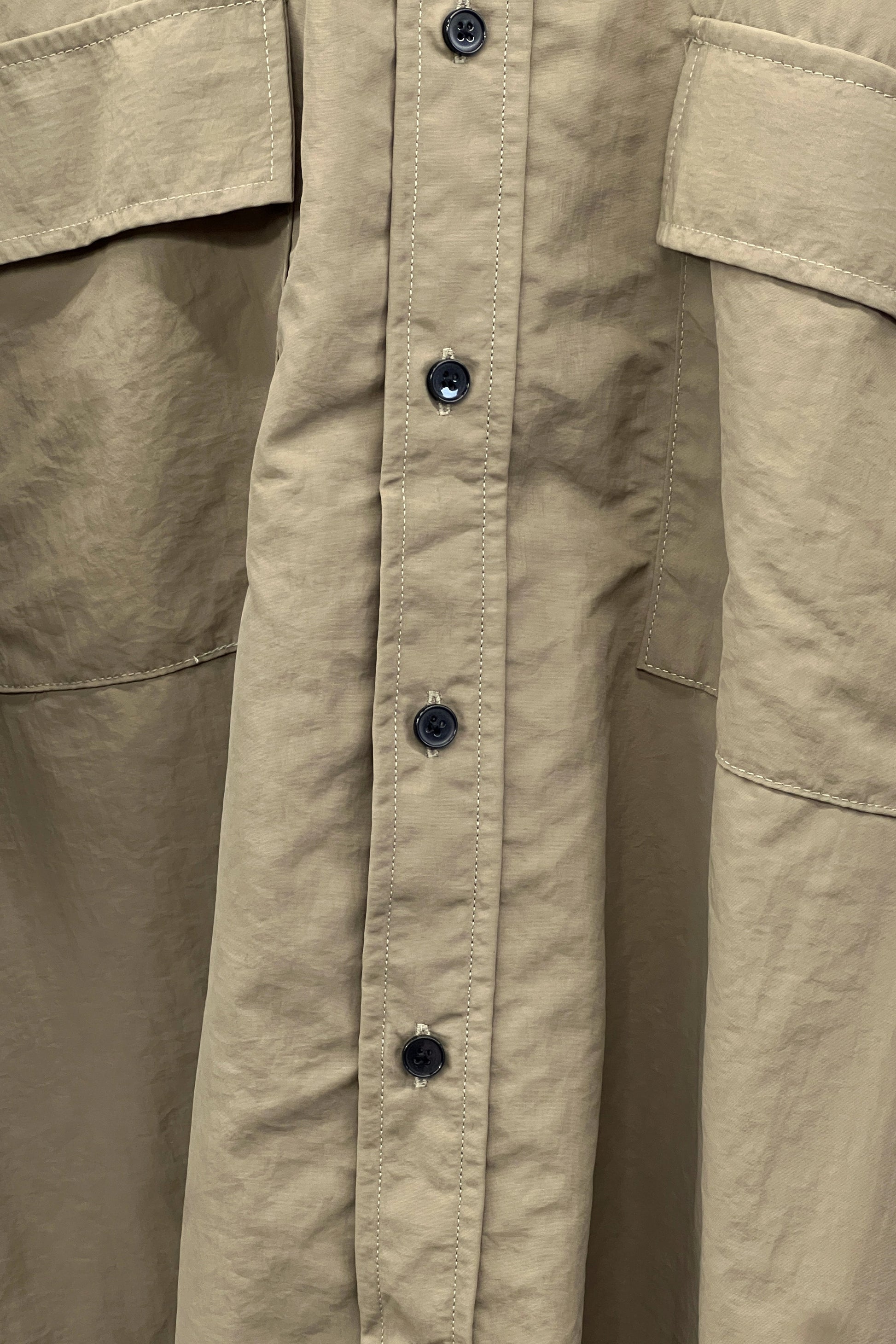 A refined utility shirt in lightweight nylon, rendered in a warm camel tone. The oversized silhouette drapes effortlessly, with a subtle technical sheen that bridges utilitarian function and modern minimalism.