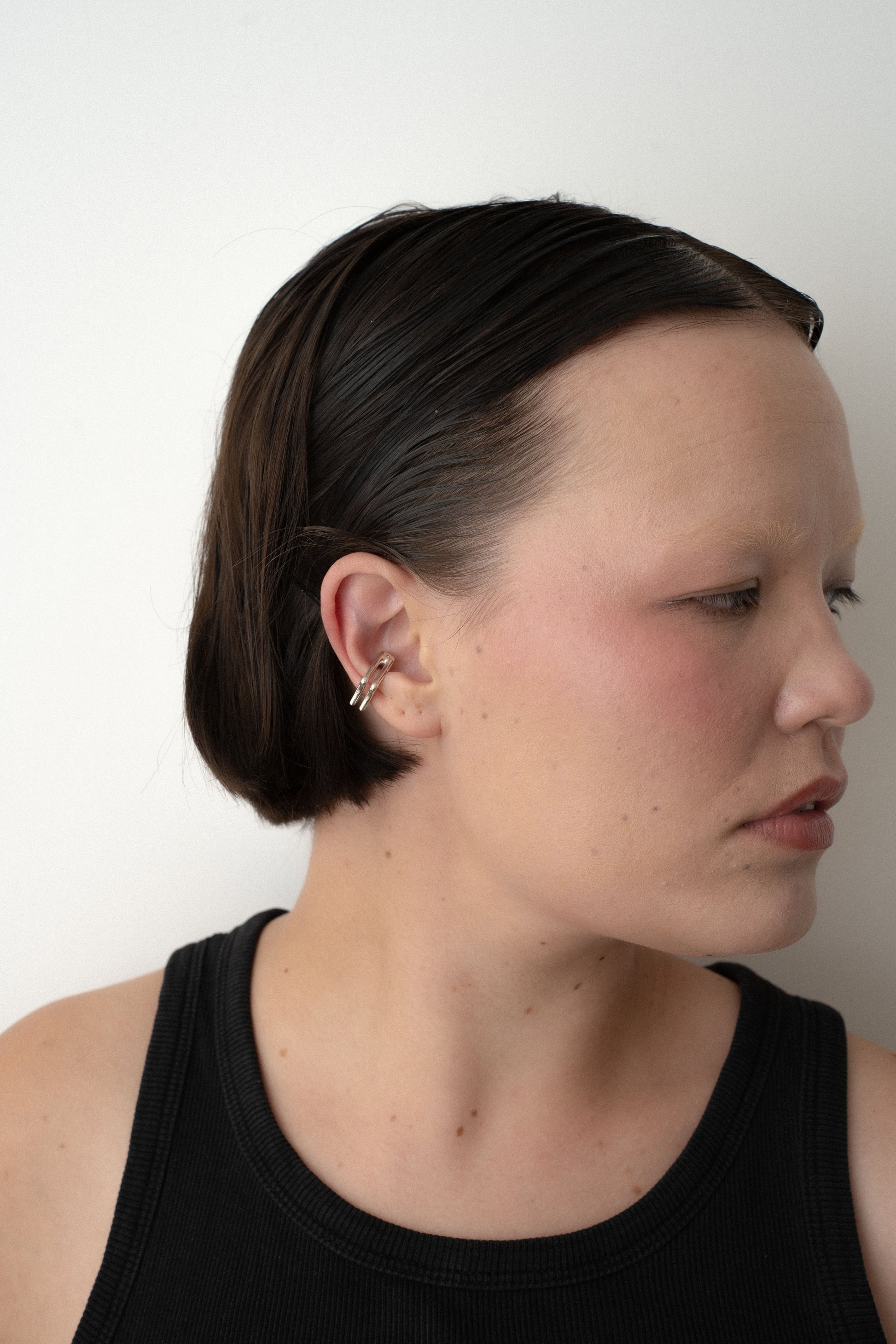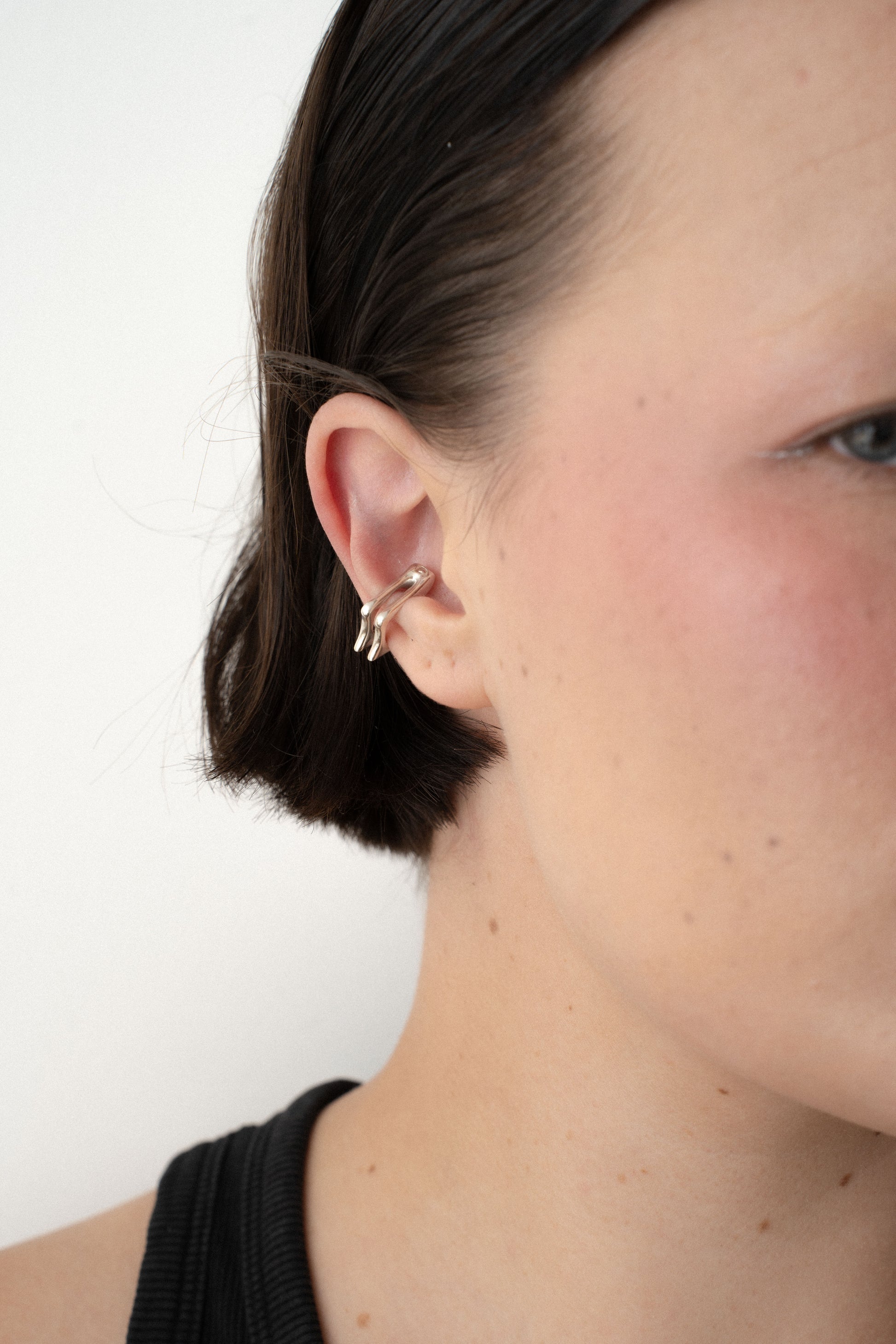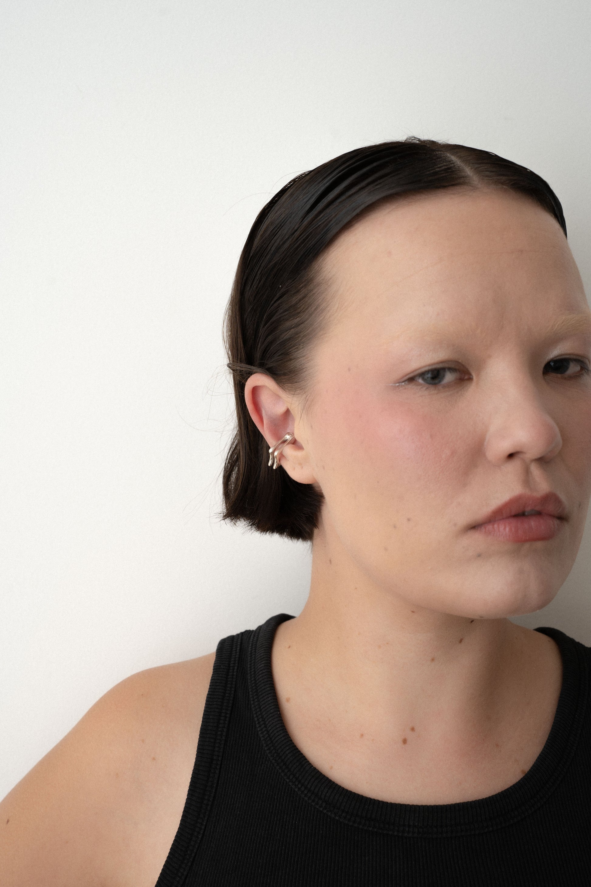 The M Valley Arch Ear Cuff Series is a sculptural form born from the digital world of M Valley. Inspired by a mysterious arc found in the sky, an ever-shifting structure of energy, it connects the galaxy in constant rotation.