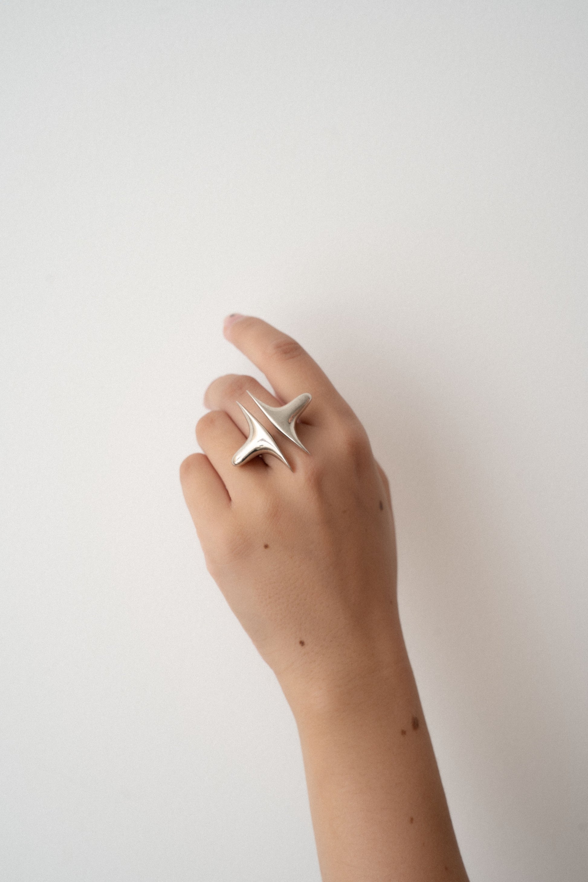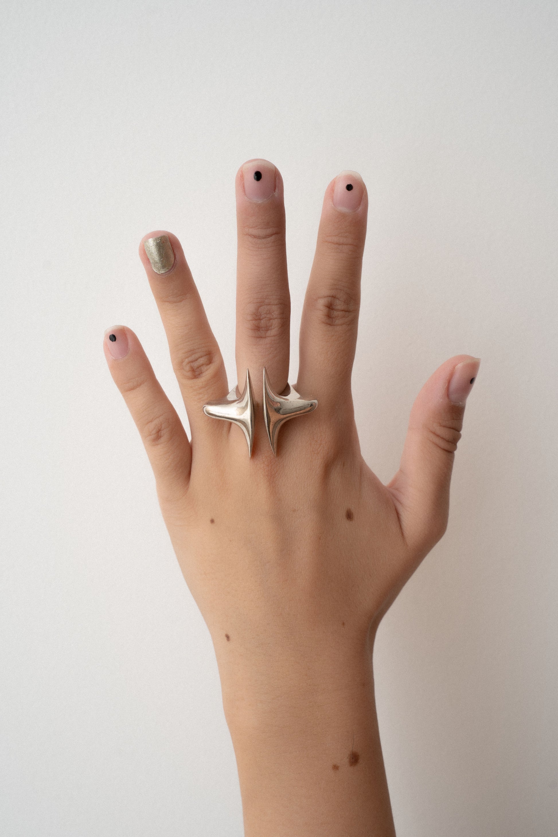 Each ring is a trace of what he saw and felt, from the organic motion of space-borne creatures to the fragmented ruins of a digital terrain. Sculptural and symbolic, they are wearable artefacts and art pieces of migration, memory, and transformation.
