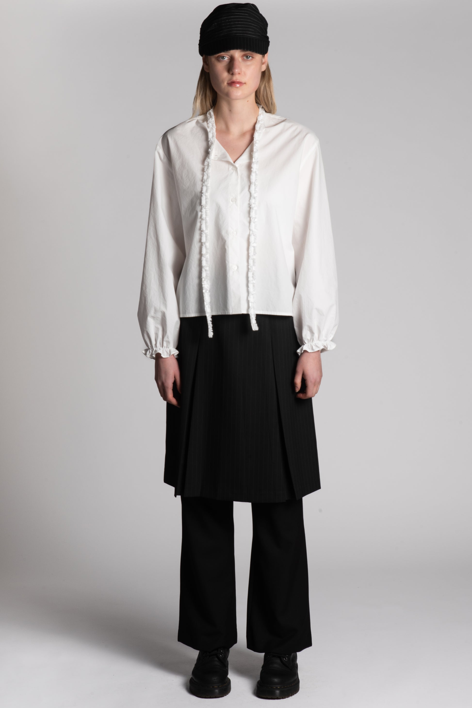 It features an integrated neck tie that can be styled in multiple ways—knotted for a structured look or left loose for a more relaxed drape. Finished with voluminous sleeves and classic button cuffs, it balances a modern silhouette with traditional shirting elements.